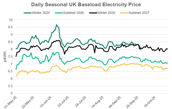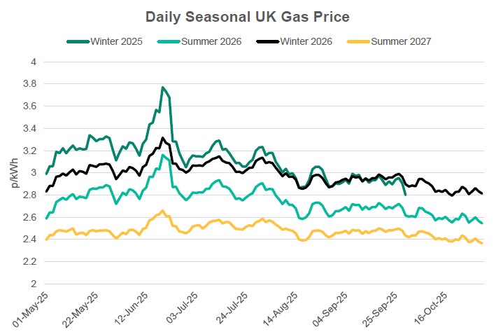 Summer 26 prices dropped through October as positive sentiment from expected new LNG capacity outweighed bullish news regarding the EU exiting Russian fuel and a lack of progress with peace talks between Ukraine and Russia. Spot gas prices in October 2025 were the lowest they have been in over a year, since July 2024, but they are still struggling to break the long-standing support level around 2.5 p/kWh.